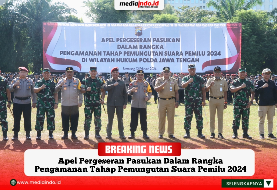 MEDIAINDO.ID – Semarang. Polda Jateng| Polda Jateng melaksanakan Apel Serpas (Pergeseran Pasukan) dalam rangka pengamanan tahap pemungutan suara pada Pemilu 2024, Apel di laksanakan di Lapangan Simpang Lima Semarang Jawa Tengah. Senin (12/2/2024).