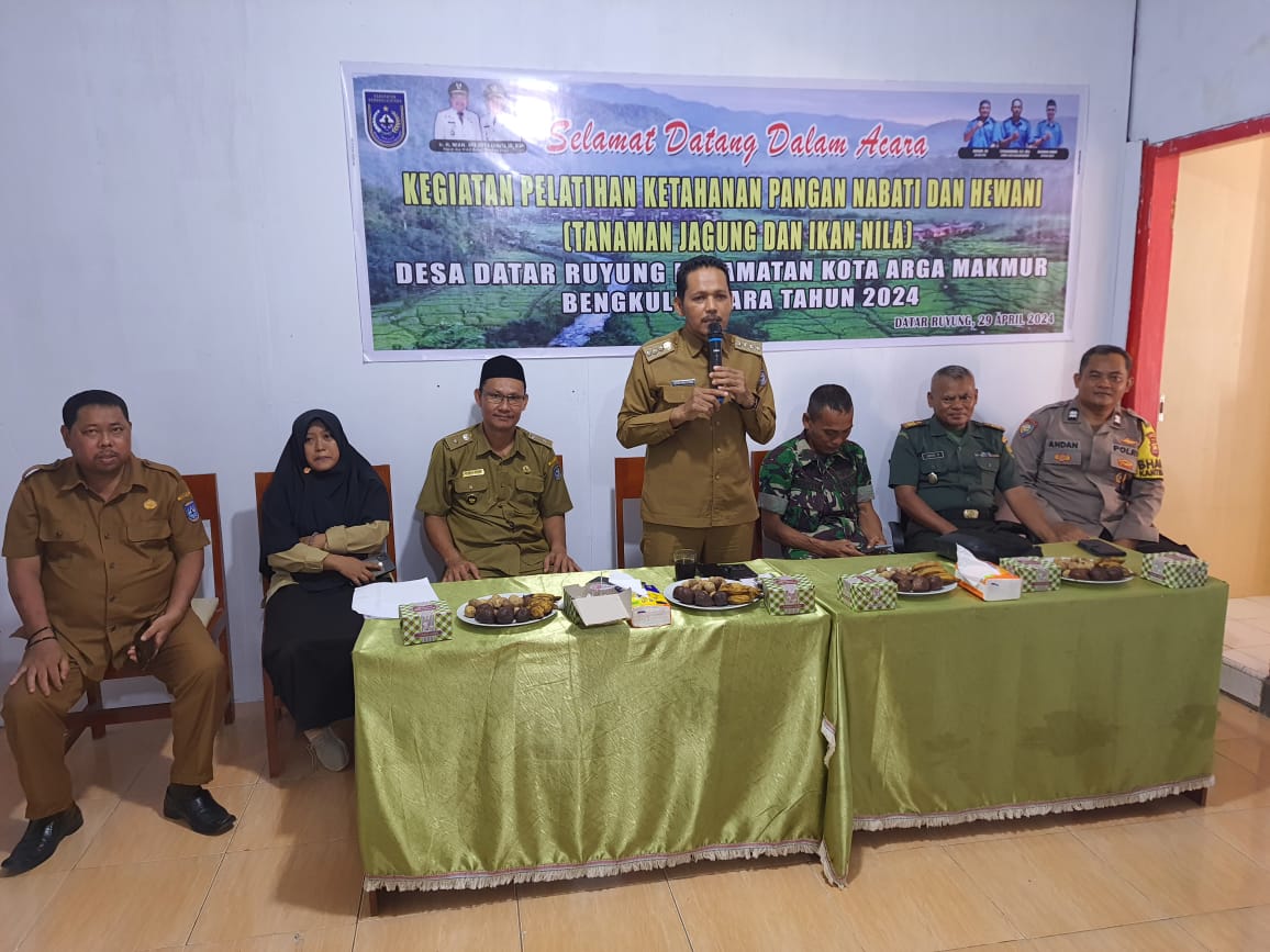 Kegiatan yang dilaksanakan di ruang aula Kantor Desa Datar Ruyung Kecamatan Arga Makmur Kabupaten Bengkulu Utara, turut dihadiri Camat Arga Makmur Bapak Syafaruddin, Danramil 423-02/Arma Kapten Cpl Joko Sulistiyono, Kepala Desa dan perangkat Desa, Ketua BPD, Ibu Maryati s.p Korluh dan PPL desa, Peltu Siswoyo Batih Wanwil Staf Teritorial Kodim, Babinsa Sertu Endang, Babinkamtibmas Aiptu Andaan dan peserta pelatihan.