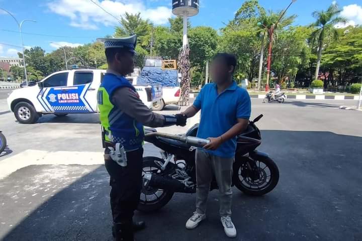 Penindakan humanis dilakukan pada Pos Polisi Bundaran Besar terhadap sejumlah pengendara sepeda motor yang terjaring masih menggunakan knalpot tidak sesuai spesifikasi di wilayah Kota Palangka Raya, Kalimantan Tengah, Sabtu (4/5/2024) pukul 13.00 WIB.