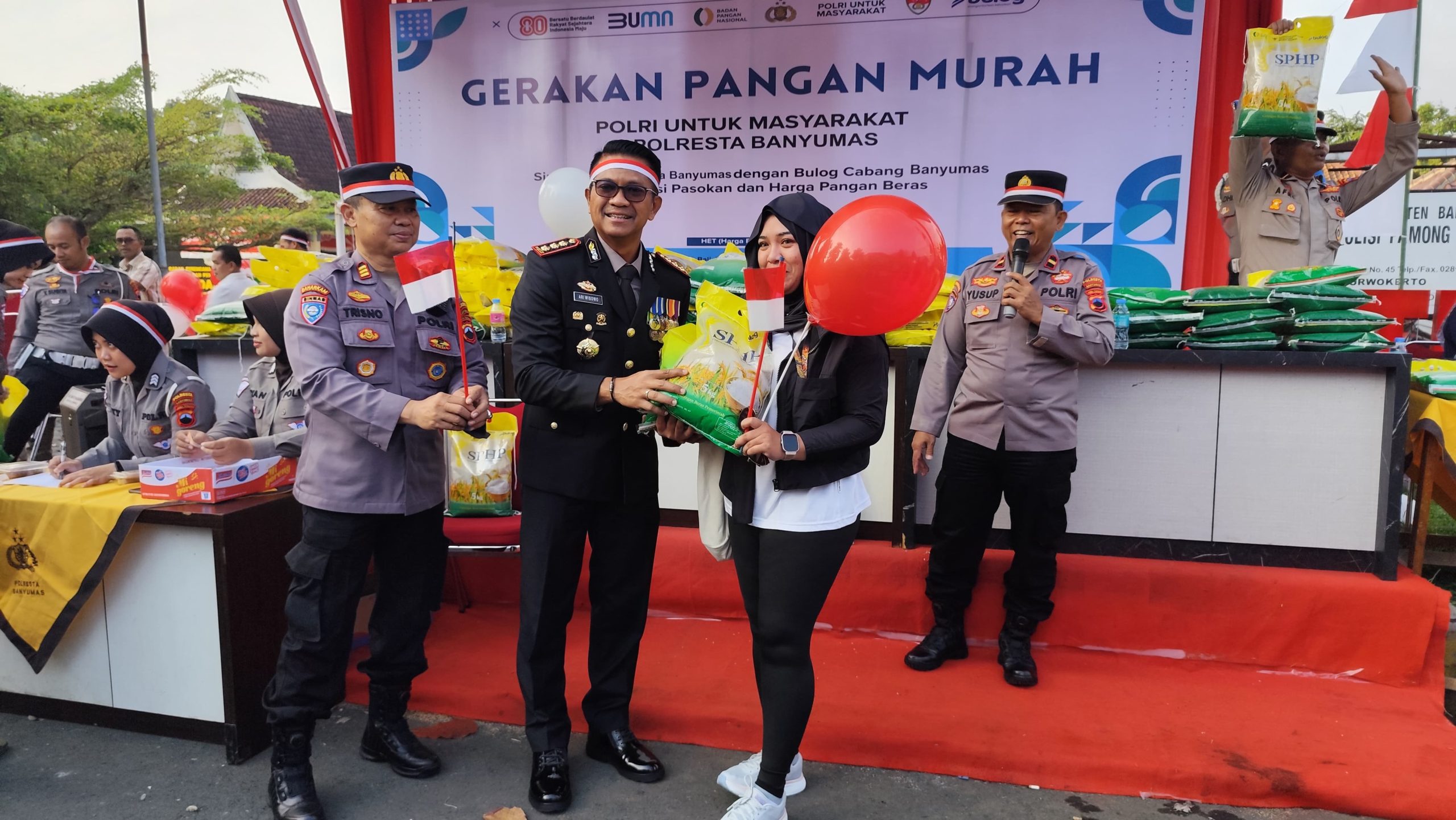 Kapolresta Banyumas Kombes Pol Dr. Ari Wibowo, S.I.K., M.H., menyampaikan pihaknya menggelorakan program pemerintah Gerakan Pangan Murah dengan menjual beras dari Bulog seharga 11.500 per kilogram pada Car Free Day Minggu pagi ini yang juga bertepatan dengan hari Kemerdekaan Republik Indonesia yang ke 80. Kurang lebih 5 Ton beras SPHP dalam kemasan per 5 kilogram untuk masyarakat telah disiapkan.