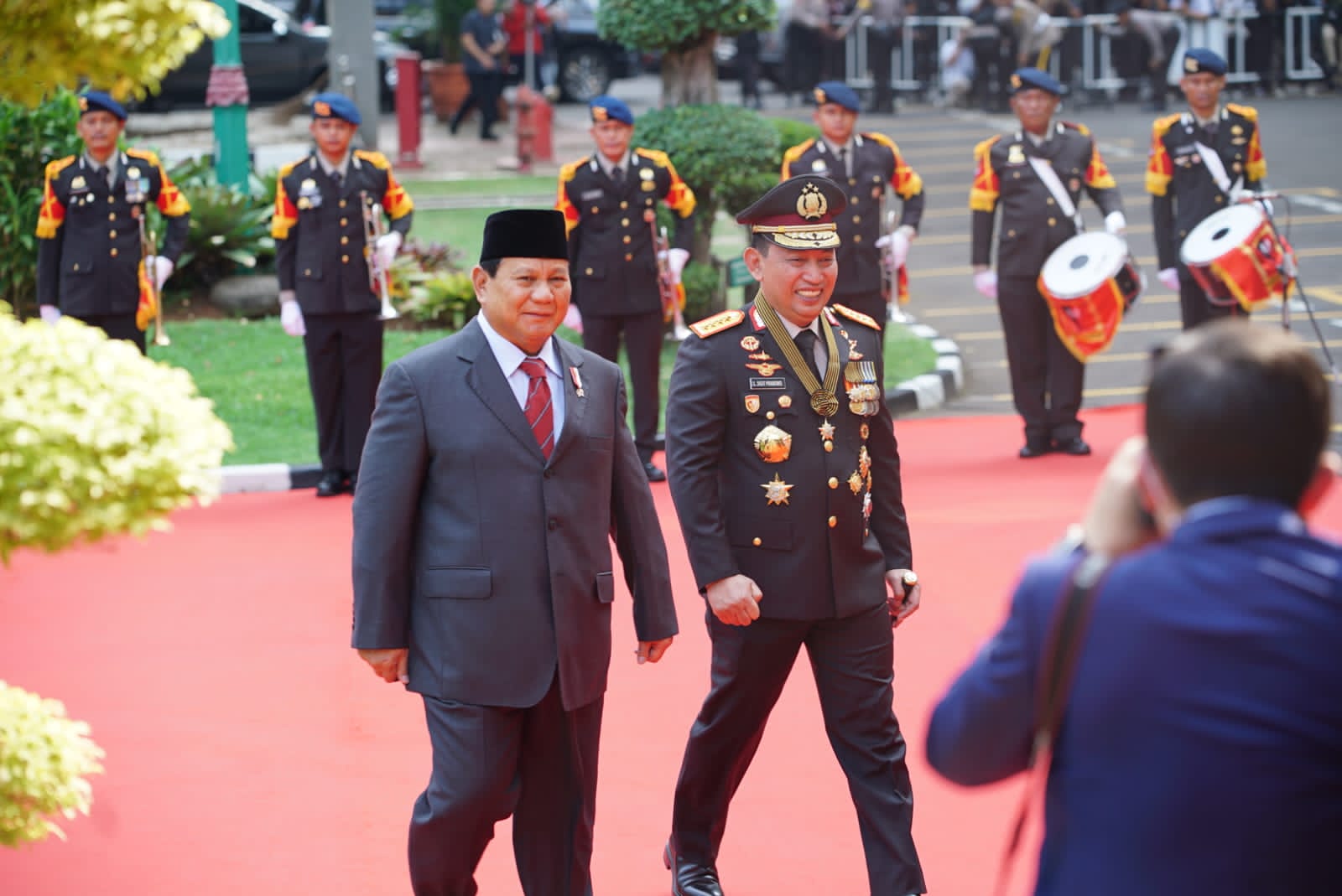 Mengenakan jas dan kopiah, Prabowo tiba di Mabes Polri sekitar pukul 14.00 WIB disambut Kapolri Jenderal Pol. Listyo Sigit Prabowo, Wakapolri Komjen Pol. Agus Andrianto dan para Pejabat Utama Mabes Polri lainnya.