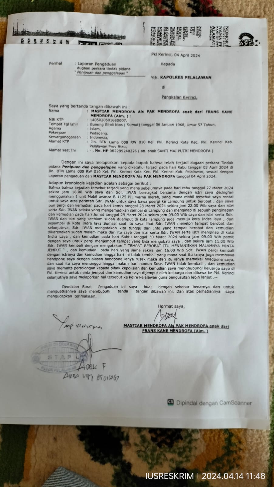“Kami telah membuat laporan pengaduan di Mapolres Pelalawan Polda Riau, melalui Aipda Adek F unit IV Reskrim Polres Pelalawan.Dan sampai hari ini belum ada informasi SP2HP. Ketika kami mendatangi mempertanyakan kembali perkembangan laporan tersebut di Unit IV Polres Pelalawan pada hari Kamis, 25 April 2024. Dan mereka mengatakan kepada kami kenapa tidak disana dilaporkan. Saya menjelaskan sudah saya laporkan tetapi tidak diterima dengan mereka karena kronologinya dari Pelalawan Riau dan laporannya disarankan di Polres Pelalawan.