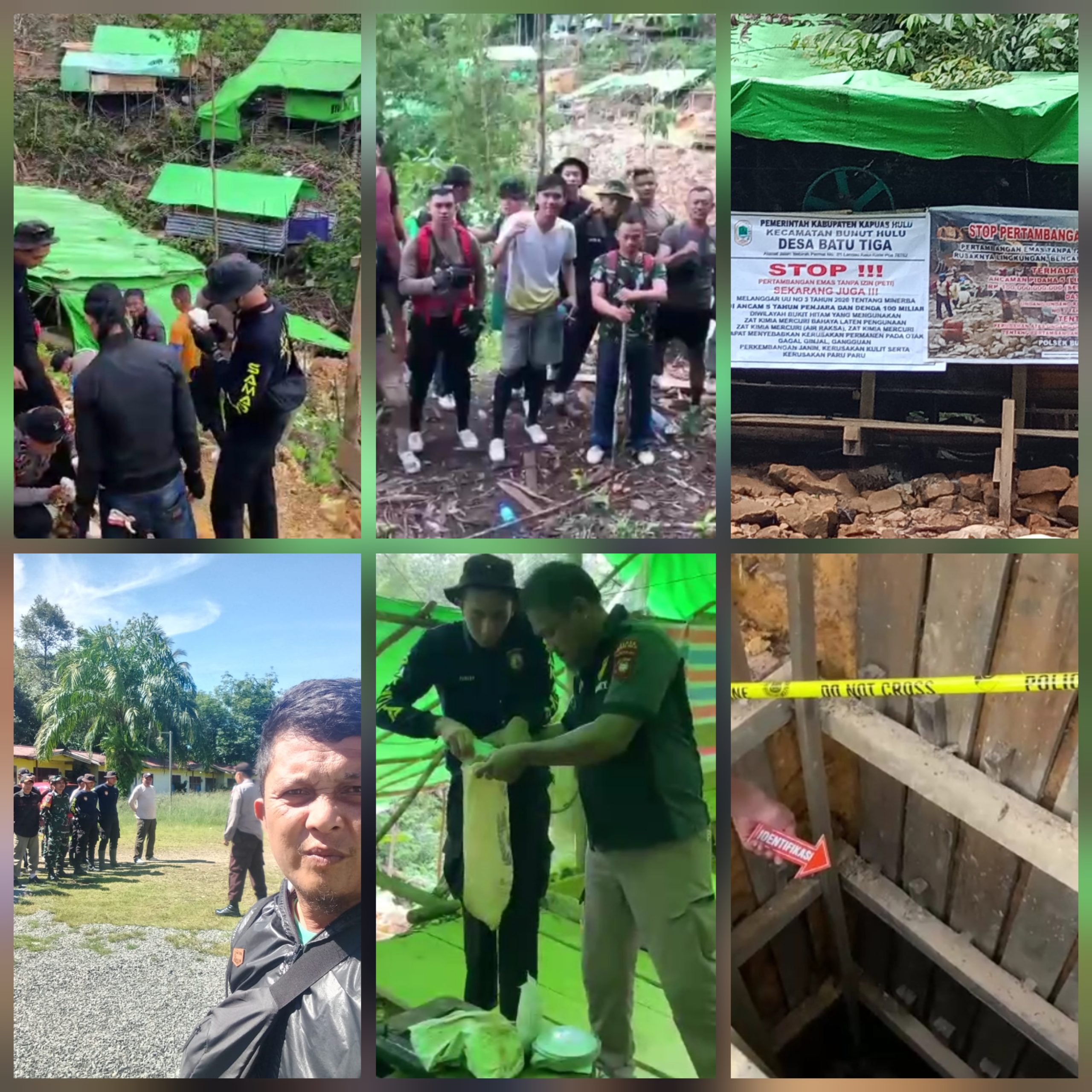 Memasang Police Line di Area tempat lokasi lobang Gelondong, Tong Rendam dan Mesin Gelondong, dan Memasang Banner Himbauan dan Pelarangan Aktivitas Kegiatan Pertambangan Emas Tanpa Ijin (PETI) di Area Bukit Hitam Dusun Landau Kaloi Desa Batu Tiga Kecamatan Bunut Hulu. Mengamankan Barang bukti yang di gunakan dalam kegiatan Pertambangan Emas Tanpa Ijin (PETI). Pungkasnya.
